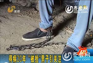 李老汉在家中翻地被邻居急促的喊叫声所停止,“你家小华把路人给打伤了”李老汉如遇晴天霹雳,认为小华不会做出这样的事。急急忙忙跑到外面,看见小华拿着棍子乱打,李老汉说着就要去拿小华手中的棍子,殊不知小华看见李老汉就是一顿乱打,头流了好多血。在村人的建议下先把小华用绳子绑上。经过这次被打之后李老汉发现了事情的严重性,为了避免小华再出去伤人。老两口无奈之下用铁链把小华栓在屋里。家境贫寒没有多余的钱来给小华治病,这一锁竟是二十年。现在年过七旬的李庆福大的愿望就是好心人帮帮他的儿子。